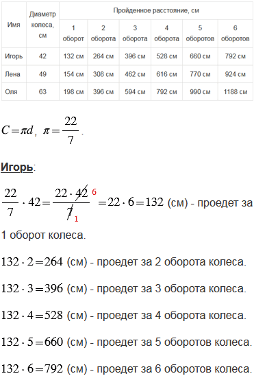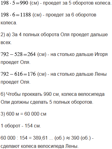 б) сколько полных оборотов должны сделать колеса велосипеда Оли, чтобы проехать 990 см.