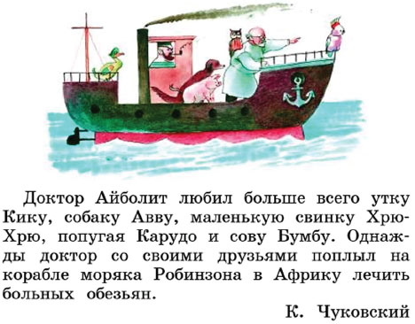 Доктор Айболит любил больше всего утку Кику, собаку Авву, маленькую свинку Хрю-Хрю, попугая Карудо и сову Бумбу. Однажды доктор со своими друзьями поплыл на корабле моряка Робинзона в Африку лечить больных обезьян.