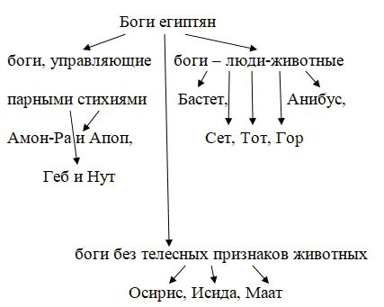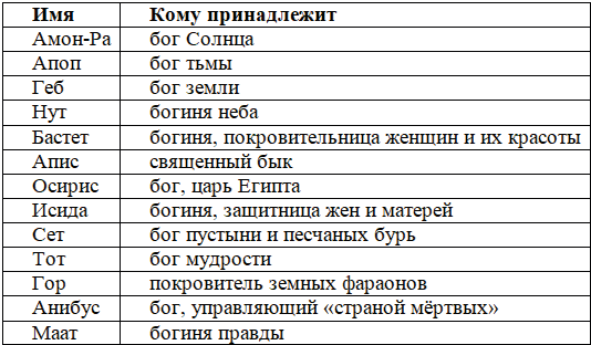1.  Главный и самый почитаемый бог - Амон-Ра - бог Солнца, каждое утро появляется он на востоке. Пока длится день, медленно он плывёт по небу в своей великолепной ладье. На голове бога сверкает круглый солнечный диск. На западном краю неба он входит в подземное царство. Здесь Амон-Ра вступает в бой с Апопом - богом тьмы, свирепым змеем. Всю ночь длится бой, когда змей повержен, снова встает солнце. Геб - бог земли в виде человека с головой змеи; Нут - богиня неба, представляли её коровой с телом, усеянным звёздами; Бастет - богиня - гибкая кошка - покровительница женщин и их красоты; Апис - большой священный чёрный бык с белой отметиной на лбу, которого содержали при одном из храмов в Мемфисе, вся страна погружалась в печаль, когда бык умирал, жрецы подыскивали тогда нового быка. Осирис - бог, бывший некогда царём в Египте, был убит по приказу родного брата Сета; Исида - богиня, жена Осириса, защитница всех жён и матерей; Сет - бог пустыни и песчаных бурь, младший брат Осириса; Тот - бог мудрости, записывал показания умерших, которые они дают Анибусу, Тот научил людей читать и писать; Гор - покровитель земных фараонов, сын Исиды и Осириса, убил Сета, когда вырос, отомстив за смерть отца; Анибус - бог, правящий в "стране мёртвых", с телом человека и чёрной головой шакала; Маат - богиня правды.