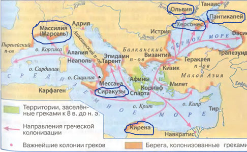 Проверьте себя. 1. Почему греки покидали Грецию и отправлялись жить в заморские страны? 2. Какими особенностями отличались те места, где греки основывали колонии? 3. Как складывались отношения греков-колонистов с местным населением?