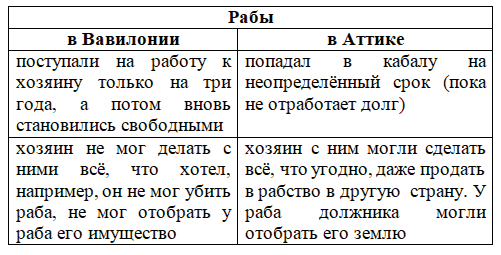 Подумайте. Чем различалось положение рабов-должников в Аттике в VII (7-м) веке до н. э. и в Вавилонии при царе Хаммурапи (см. §14, п. 5)? Где оно было хуже? Чем хуже? Ответ представьте в тетради в виде схемы или таблицы.