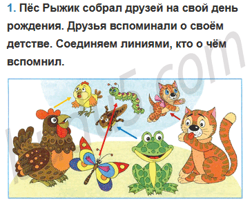 1. Пёс Рыжик собрал друзей на свой день рождения. Друзья вспоминали о своём детстве. Кто о чём вспомнил? Соедини линиями.