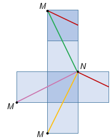 Для того, чтобы найти самый короткий путь по поверхности куба от точки М к точке N, начертим развертку куба.