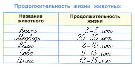 3. В дополнительной литературе, Интернете найдите сведения о продолжительности жизни разных животных. Заполните таблицу.