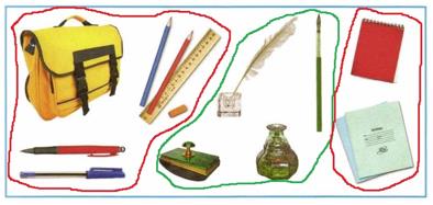 1. Какие из этих школьных принадлежностей использовались в прошлом? Обведи их зелёным карандашом. Чем мы пользуемся сейчас? Обведи эти предметы красным карандашом.