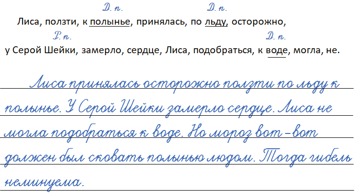 Лиса, ползти, к полынье (Д. п.), принялась, по льду (Д. п.), осторожно, у Серой Шейки (Р. п.), замерло, сердце, Лиса, подобраться, к воде (Д. п.), могла, не.