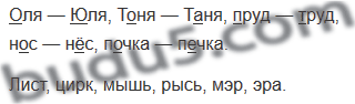 Оля — Юля, Тоня — Таня, пруд — труд, нос — нёс, почка — печка.