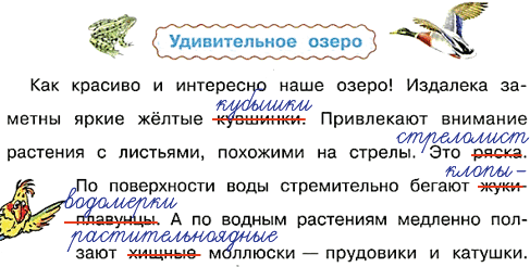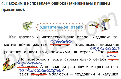 4. Наш любознательный Попугай побывал на озере и спешит поделиться впечатлениями. Прочитай его рассказ на с. 76. Всё ли в нём верно? Найди и исправь ошибки (зачеркни и напиши правильно).
