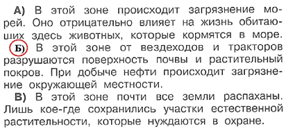Б) В этой зоне от вездеходов и тракторов разрушаются поверхность почвы и растительный покров. При добыче нефти происходит загрязнение окружающей местности.