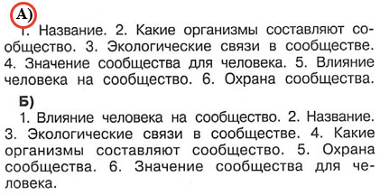 А) 1. Название. 2. Какие организмы составляют сообщество. 3. Экологические связи в сообществе. 4. Значение сообщества для человека. 5. Влияние человека на сообщество. 6. Охрана сообщества.
