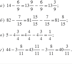 Если дробная часть уменьшаемого меньше дробной части вычитаемого, то дробную часть уменьшаемого делают неправильной дробью, заняв единицу в его целой части.
