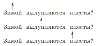 Эти предложения различны по смыслу, стрелкой показано слово, которое требует ответа-подтверждения. В каждом предложении автора интересует разная информация о птицах. В первом предложении важно время года, в которое вылупляются клесты - зима. Во втором предложении важно то, что именно происходит с клестами зимой - они вылупляются. А в третьем предложении задаётся вопрос о том, кто именно вылупляется зимой.