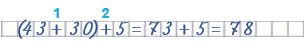 2) (43 + 30) + 5 = 73 + 5 = 78