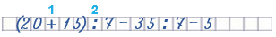4) (20 + 15) : 7 = 35 : 7 = 5