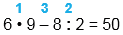 1) 6 • 9 = 54 2) 8 : 2 = 4 3) 54 - 4 = 50