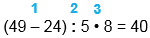 1) 49 - 24 = 25 2) 25 : 5 = 5 3) 5 • 8 = 40