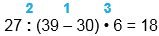 1) 39 - 30 = 9 2) 27 : 9 = 3 3) 3 • 6 = 18 |