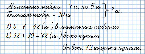 93. Для украшения ёлки купили 7 маленьких наборов шаров, по 6 шаров в каждом, и один большой набор, в котором 30 шаров. Сколько всего шаров купили?