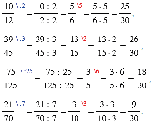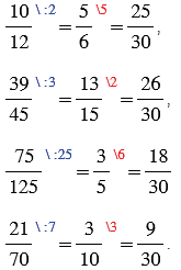 Чтобы привести дроби к новому знаменателю 30, умножаем числитель и знаменатель дроби на такой дополнительный множитель (в решении дополнительный множитель выделен красным цветом), при умножении на который в знаменателе получится 30. Чтобы найти дополнительный множитель необходимо новый знаменатель, то есть 30, разделить на знаменатель, полученный после сокращения.