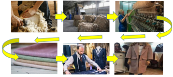 Животноводство занимается выращиванием овец. Шерсть взрослых овец состригают и отправляют на промышленное предприятие. Там шерсть проходит очистку, промывку, сортировку, затем из неё прядут вязальную нить. На ткацких станках создают шерстяное полотно. При помощи оттиска на него наносят различные рисунки. Портной из готовой шерстяной ткани кроит и шьёт одежу, которую везут в магазины для покупателей.