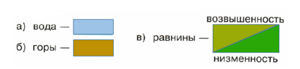 3. Голубым цветом на карте обозначена вода, а зелёным, жёлтым и коричневым – суша. Зелёным и жёлтым цветом обозначают равнины, а коричневым – горы.