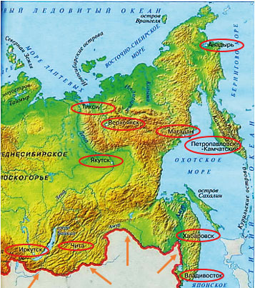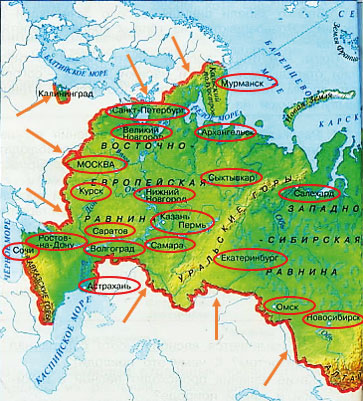 Крупные города России подписаны на карте: Москва, Санкт – Петербург, Мурманск, Архангельск, Великий Новгород, Сыктывкар, Курск, Нижний Новгород, Казань, Пермь, Саратов, Самара, Волгоград, Ростов – на – Дону, Сочи, Симферополь, Астрахань, Екатеринбург, Сочи, Омск, Новосибирск, Тикси, Верхоянск, Якутск, Иркутск, Чита, Хабаровск, Владивосток, Петропавловск – Камчатский, Магадан, Анадырь. (Обведены красным овалом)