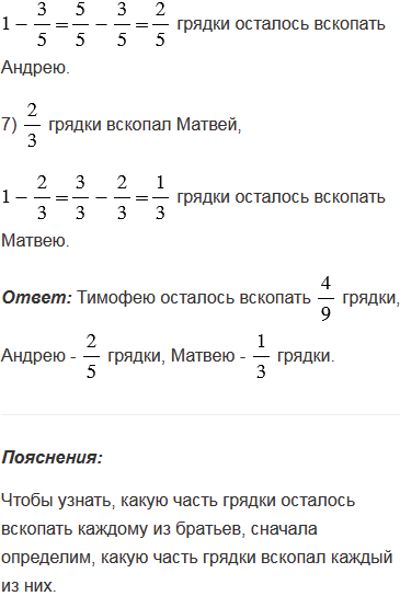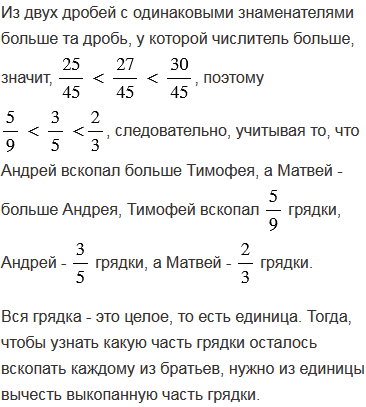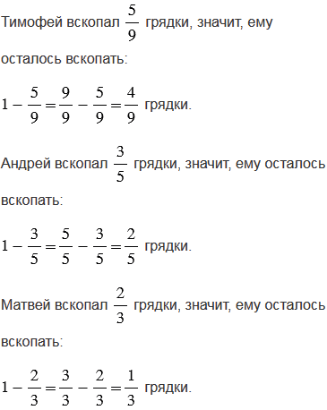 грядки. Какую часть грядки осталось вскопать каждому, если известно, что Андрей вскопал больше Тимофея, а Матвей - больше Андрея?