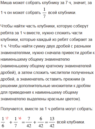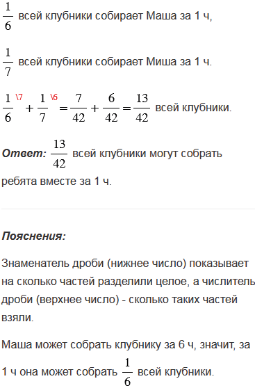 Маша может собрать клубнику за 6 ч, а Миша - за 7 ч. Какую часть клубники они могут собрать вместе за 1 ч?