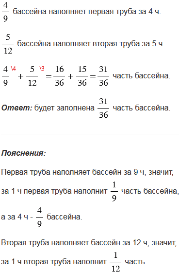 Одна труба может наполнить бассейн за 9 ч, а другая - за 12 ч. Какая часть бассейна будет заполнена после того, как первая труба отработает 4 ч, а вторая - 5 ч?