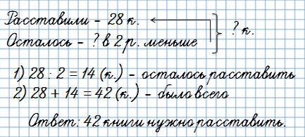 4. После того как в библиотеке расставили на полки 28 книг, осталось расставить в 2 раза меньше книг, чем расставили. Сколько всего книг надо было расставить на полки?