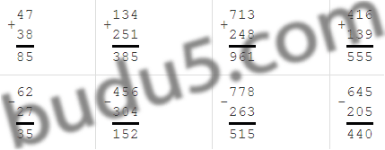 | 1) 47 + 38 | 134 + 251 | 713 + 248 | 416 + 139 |