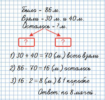 53. В двух коробках было 86 теннисных мячей. Когда из одной коробки взяли 30 мячей, а из другой - 40, то мячей в двух коробках стало поровну. Сколько мячей стало в каждой коробке?