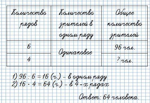 4. На телеигру пришло 96 зрителей. Всех зрителей рассадили поровну на 6 рядов кресел. Сколько зрителей размещается на четырёх таких рядах?