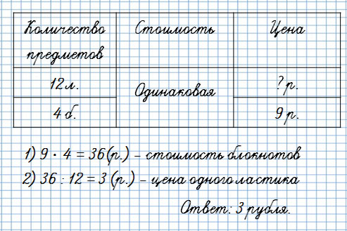 5. За 4 одинаковых блокнота заплатили столько же рублей, сколько за 12 ластиков. Сколько стоит один ластик, если блокнот стоит 9 р.?