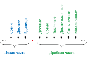 При чтении десятичной дроби сначала называют ее часть, стоящую перед запятой, и добавляют слово "целых"; затем называют часть, стоящую после запятой, и добавляют название последнего разряда.