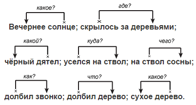 1. Солнце скрылось; вечернее солнце; скрылось за деревьями. 2. Чёрный дятел; дятел уселся; уселся на ствол; на ствол сосны. 3. Он долбил; долбил звонко; долбил дерево; сухое дерево.