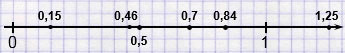 На координатной прямой, единичный отрезок которой равен 10 см, отметьте числа 0,15; 0,5; 0,7; 0,46; 0,84; 1,25.