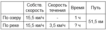 Рыбак на моторной лодке двигался сначала 1 ч по озеру, а потом по реке, впадающей в озеро, преодолев за все время 51,5 км. Сколько времени он двигался по реке, если собственная скорость лодки 15,5 км/ч, скорость течения реки 3,5 км/ч?
