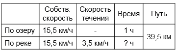 Рыбак на моторной лодке двигался сначала 1 ч по озеру, а потом по реке, впадающей в озеро, преодолев за все время 39,5 км. Сколько времени он двигался по реке, если собственная скорость лодки 15,5 км/ч, скорость течения реки 3,5 км/ч?