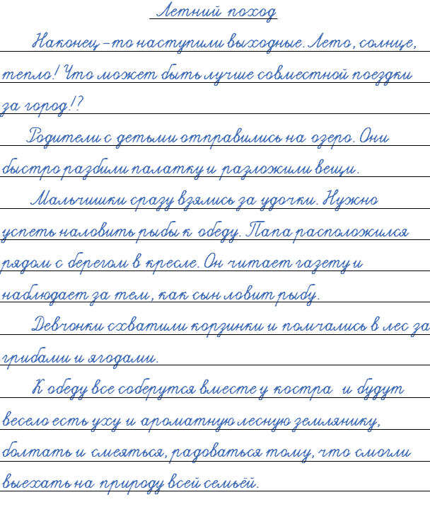 После окончания начальной школы ребята поехали в поход. За городом на берегу живописной речки дети вместе с родителями поставили палатки. Мальчишки тут же достали удочки и принялись рыбачить. На обед должна быть ароматная уха. Девочки взяли корзинки и поспешили в лес за ягодами на десерт. Родители с удовольствием наблюдали за детьми и отдыхали на свежем воздухе. Поход удался на славу!