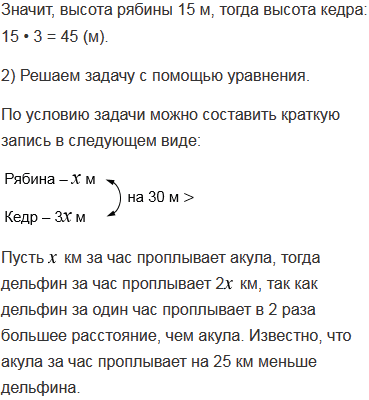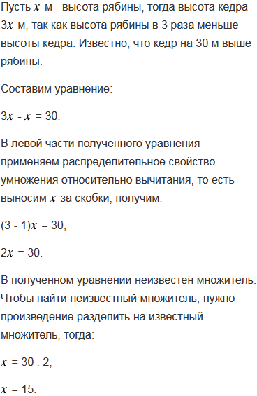 1) Высота рябины в 3 раза меньше высоты кедра. Кедр на 30 м выше рябины. Найдите высоту деревьев