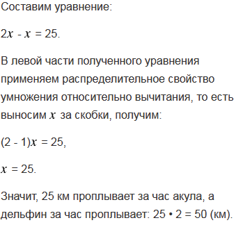 2) Дельфин за один час проплывает в 2 раза большее расстояние, чем акула. Акула за час проплывает на 25 км меньше дельфина. Какое расстояние проплывает за час дельфин, а какое - акула?