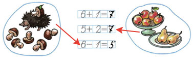 Было 6 грибов. Ёжик унёс 1 гриб. Сколько грибов осталось? Унёс, значит, убрали. Уменьшили. Вычитание. Знак минус. Как записать?