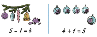На ветке висело 5 ёлочных игрушек. Одна упала и разбилась. Сколько игрушек осталось на ветке? Упала, значит, убрали. Уменьшилось. Вычитание. Знак минус. Как это записать?
