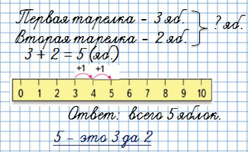 Было 3 новогодних шара. Принесли ещё 1 шар. Сколько шаров стало? Принесли, значит, добавили. Увеличилось. Сложение. Знак плюс. Как это записать?