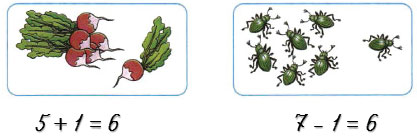 Было 5 редисок, добавили еще 1 редиску. Сколько редисок стало? Сколько стало? Добавили. Увеличилось. Сложение. Знак плюс. Как это записать?