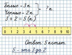 1) У кошки 3 белых котёнка и 2 чёрных. Сколько всего котят у кошки?