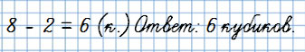 2) В коробке было 8 кубиков. Миша взял из коробки 2 кубика. Сколько кубиков осталось в коробке?