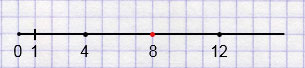 Далее чертим координатный луч с началом 0 и единичным отрезком, равным одной клетке. Отмечаем точки с координатами 4, 8 и 12.