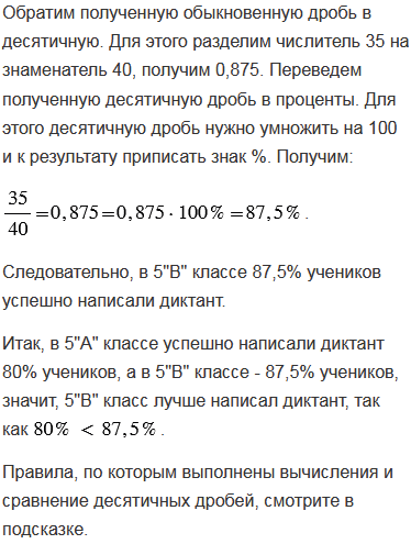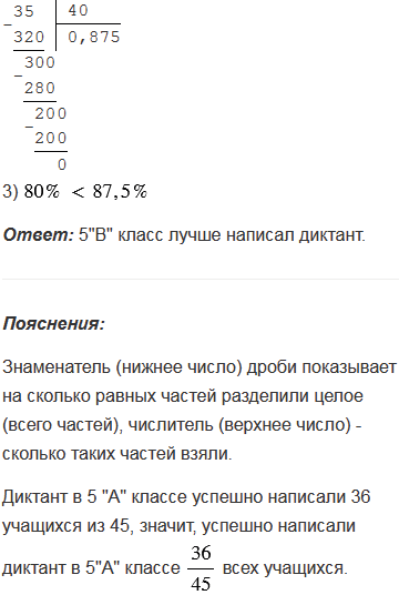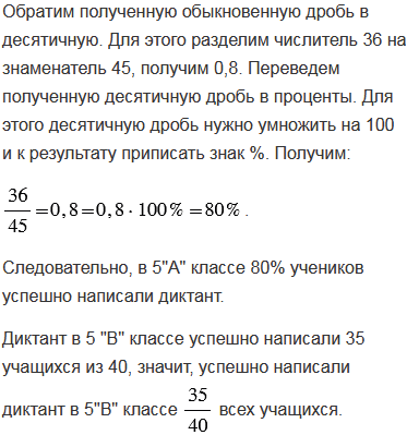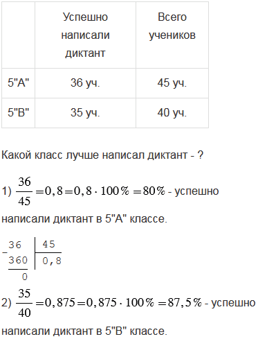 Диктант в 5 "А" успешно написали 36 учащихся, а в 5 "В" - 35 учащихся. Какой класс лучше написал диктант, если в 5 "А" 45 учеников, а в 5 "В" 40 учеников?